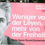 Wahlplakat zur Europawahl 2024 der FDP mit Marie Agnes Strack-Zimmermann. Darauf steht: „Weniger von der Leyen, mehr von der Freiheit:“ „Freiheit“ ist heute häufig ein